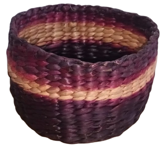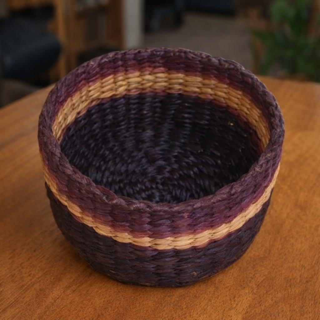 This product appears to be a handwoven round basket made from natural fibers, likely jute, palm leaves, or water hyacinth. A handcrafted round basket made from tightly woven natural fibers. It features a deep bowl-like shape with sturdy walls and a slightly reinforced rim. The basket is colored in a **dark, almost black shade Uses-