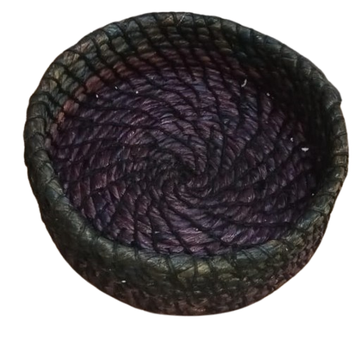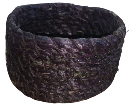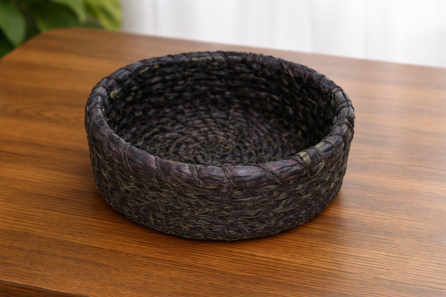 This product appears to be a handwoven round basket made from natural fibers, likely jute, palm leaves, or water hyacinth. A handcrafted round basket made from tightly woven natural fibers. It features a deep bowl-like shape with sturdy walls and a slightly reinforced rim. The basket is colored in a dark, almost black shade Uses-