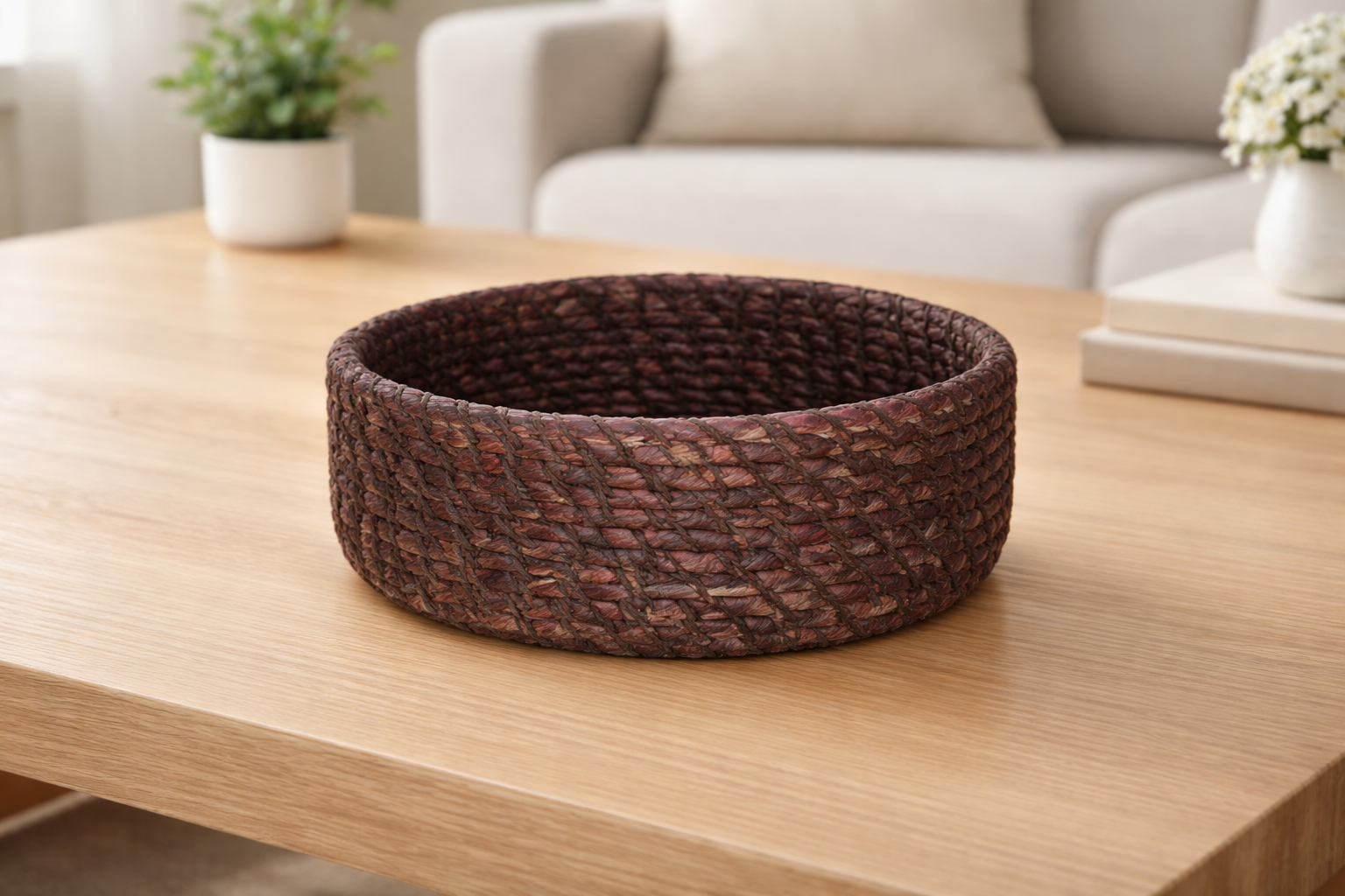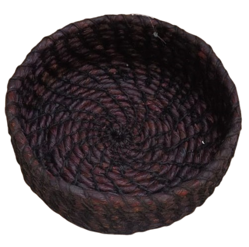 This product appears to be a handwoven round basket made from natural fibers, likely jute, palm leaves, or water hyacinth. A handcrafted round basket made from tightly woven natural fibers. It features a deep bowl-like shape with sturdy walls and a slightly reinforced rim. The basket is colored in a **dark, almost black shade Uses-