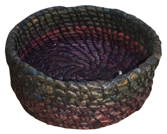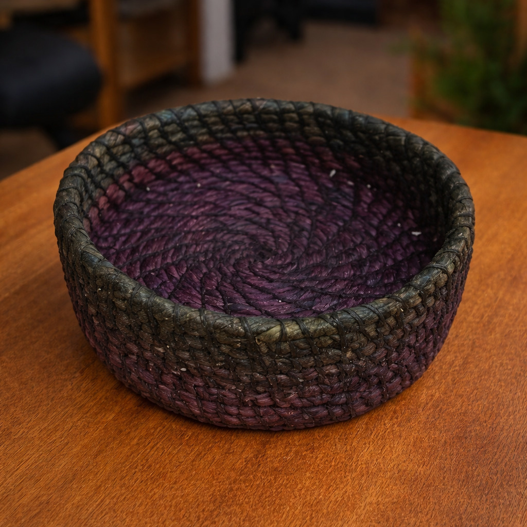 This product appears to be a handwoven round basket made from natural fibers, likely jute, palm leaves, or water hyacinth. A handcrafted round basket made from tightly woven natural fibers. It features a deep bowl-like shape with sturdy walls and a slightly reinforced rim. The basket is colored in a **dark, almost black shade Uses-
