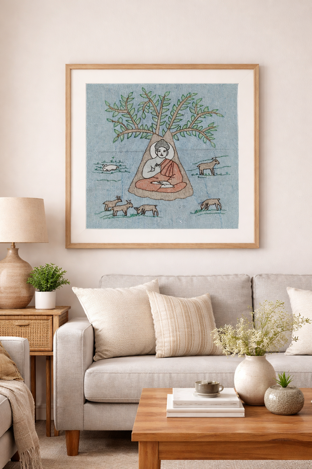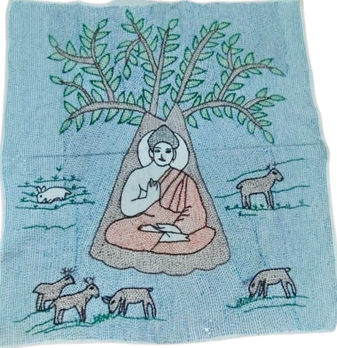 This appears to be a **hand-embroidered textile artwork** on a piece of blue fabric. The embroidery features a seated, meditating figure** positioned under a large stylized tree** with many branching leaves. * Around the central figure, there are **embroidered animals** such as goats or deer grazing on grass. * The stitching uses **multiple colors**—greens for the tree, browns for the figure’s clothing, and light shades for the animals. * The fabric is unfinished at the edges, suggesting it is a **work in progress** or a **panel meant to be framed or used in a larger