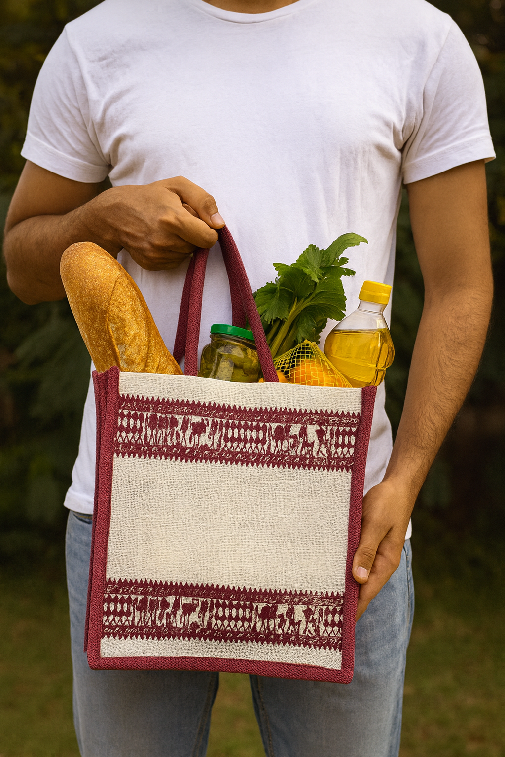 Maroon-colored borders and handles, giving it a bold, earthy contrast Two horizontal Warli- style pattern bands—one at the top and one at the bottom—depicting tribal figures, animals, and geometric motifs in maroon print Sturdy dual handles made of matching maroon fabric, suitable for hand carrying The bag has a clean, minimalist look with cultural artwork, making it ideal for daily use, gifting, or eco-friendly carry purposes.