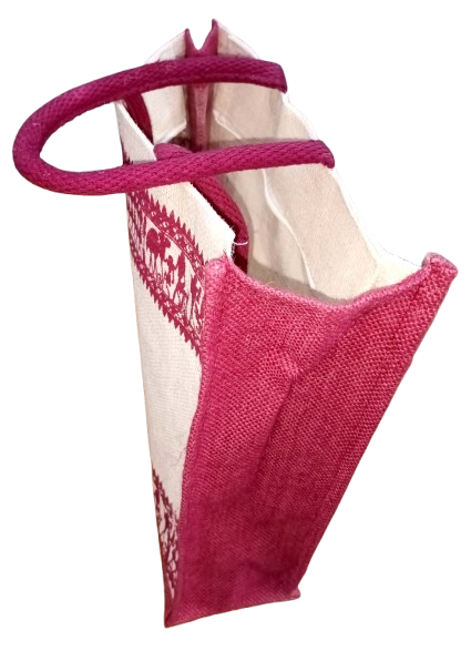 This jute product is a handcrafted jute tote bag featuring a simple yet traditional ethnic design. It has: