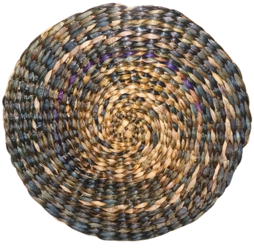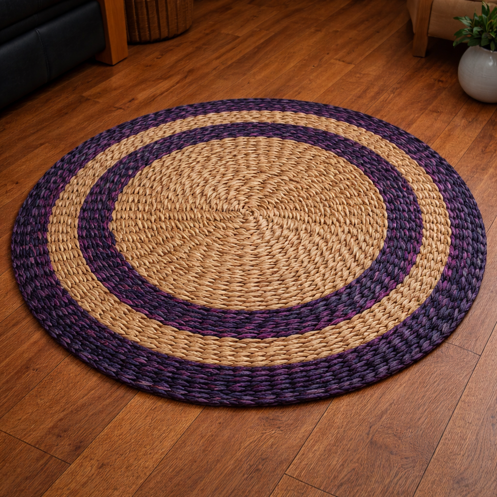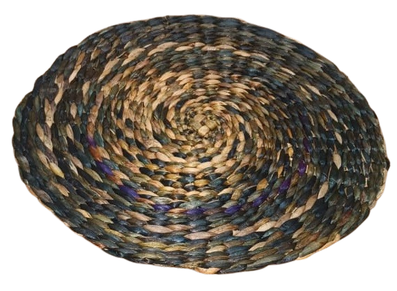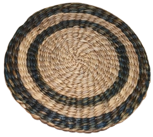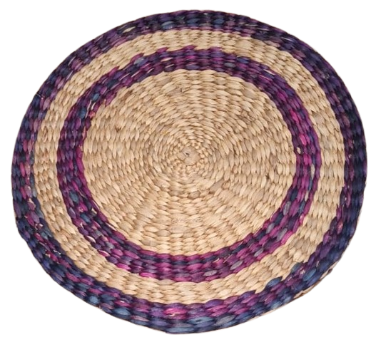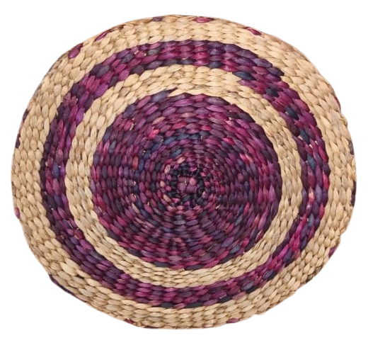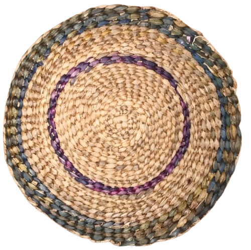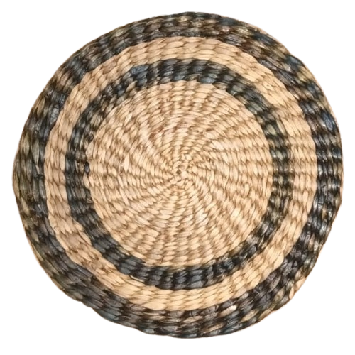 This is a handwoven round jute placemat, crafted from natural braided jute fibre. The mate features a concentric circular design, with the center made of tightly braided natural jute and an outer border decorated with a two-ring pattern in earthy green and brown tones. The natural texture and sturdy weaving make it ideal for use as a table placemat, hot plate base, decorative center piece, or dining table accessory. Its rustic look adds a warm, eco-friendly touch to any home décor