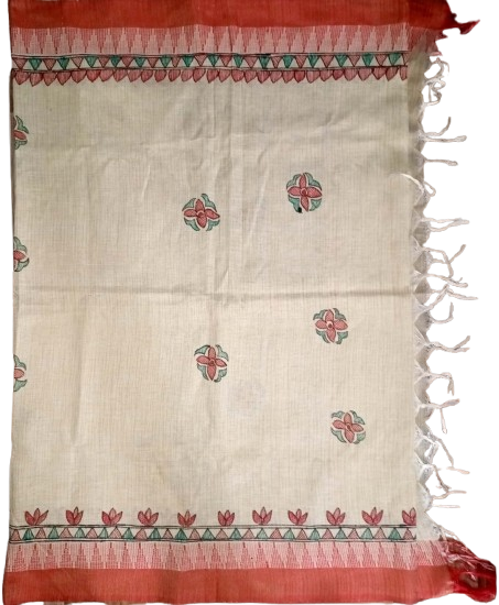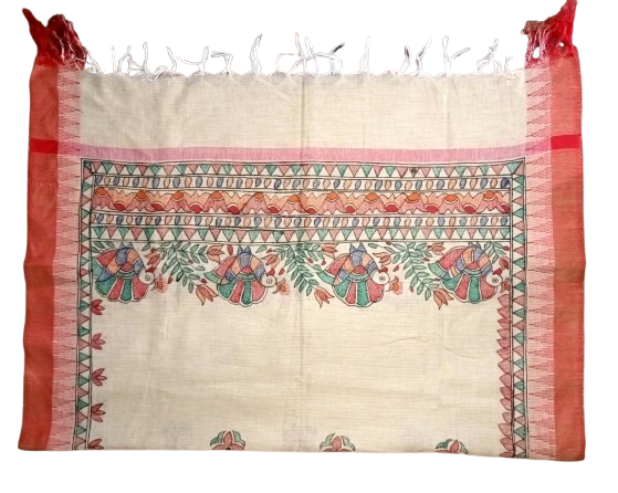 Design Style: Traditional hand-painted folk art, inspired by A decorative border on all sides** with geometric triangular patterns .Scattered floral motifs across the upper portion. A richly illustrated floral-and-peacock style pattern** running along the bottom. Colors Used Earthy tones like pink, green, orange, and blue.fashion stole/dupatta festive or ethnic accessory gift item showcasing Indian handcraft