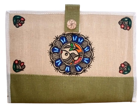 Made from eco-friendly jute fabric Decorated with hand-painted Madhubani art Central fish motif symbolizing prosperity & good luck