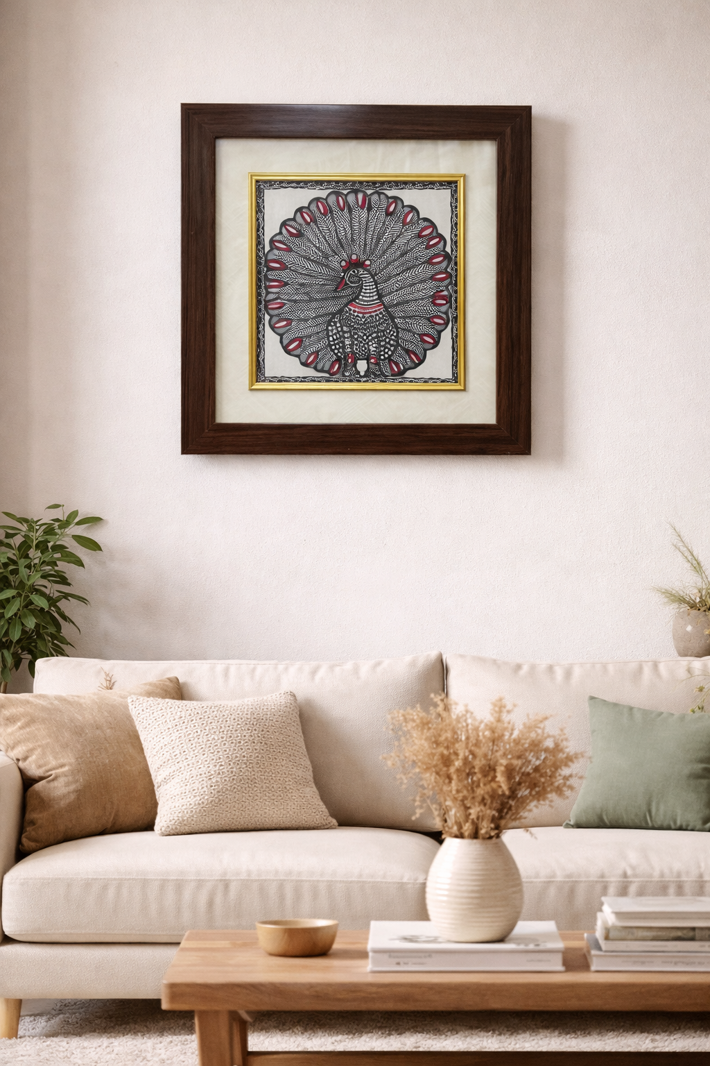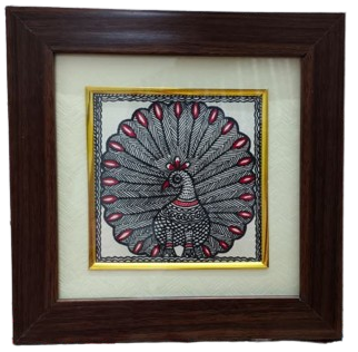 This product showcases a traditional Mithila painting beautifully framed to highlight its intricate folk-art detailing. The artwork features a majestic peacock, one of the most celebrated motifs in Madhubani art, symbolizing beauty, grace, and prosperity The peacock is illustrated with Highly detailed linework Fine cross-hatching and patterned textures Red highlights on the feathers and ornamental elements, adding vibrancy to the monochrome style The bird’s tail is fully fanned out, forming an ornate circular pattern decorated with leaf-like feather shapes A classic Madhubani border surrounds the artwork, enhancing the traditional aesthetic. The painting is mounted on a cream-colored mat board, bordered with an elegant golden inner frame Encased in a rich brown wooden frame, the piece is ready for wall display or tabletop décor.