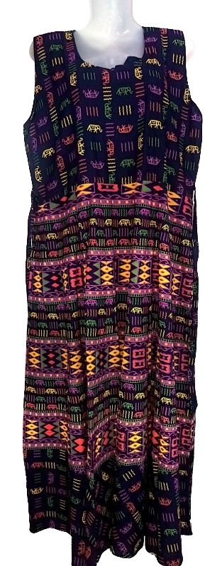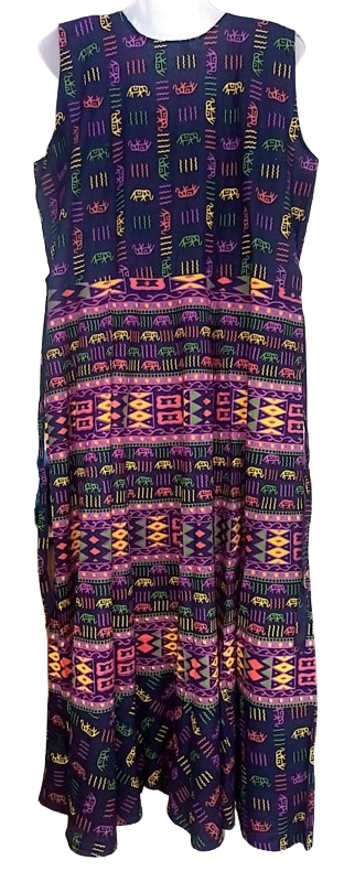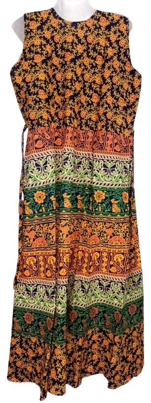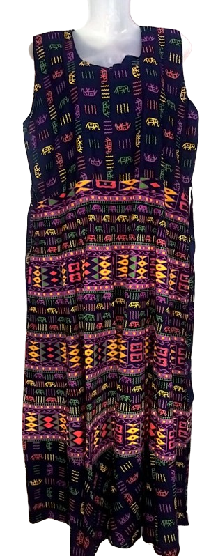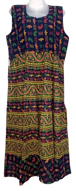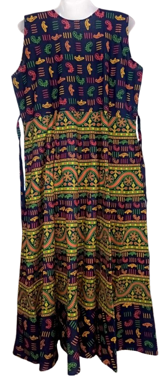This elegant sleeveless ethnic dress features a rich dark base adorned with vibrant multicolour traditional motifs inspired by folk art. The all-over geometric and symbolic print adds a handcrafted appeal, while the tiered pattern near the hem creates visual depth and graceful movement. Designed with a comfortable round neckline and a relaxed silhouette, this dress is perfect for everyday wear, casual outings, or cultural gatherings. Crafted from soft, breathable fabric, it ensures all-day comfort while making a bold style statement.