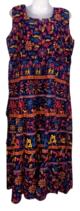 This dress features a vibrant Warli tribal art theme inspired by traditional Indian folk motifs. The multicolour human and nature figures, rhythmic dance patterns, animals, and village life elements are artistically arranged across the navy-blue base, giving the outfit an ethnic yet contemporary boho look. The design reflects cultural storytelling and handcrafted artistry, making it ideal for casual, festive, and ethnic-fusion wear.