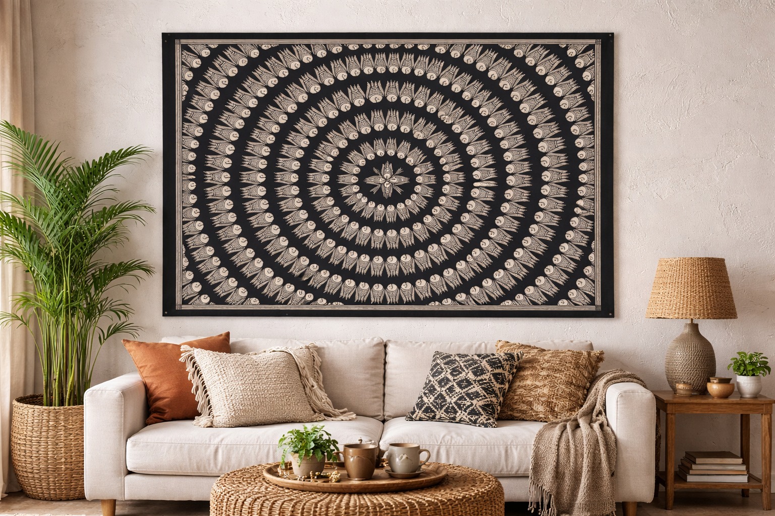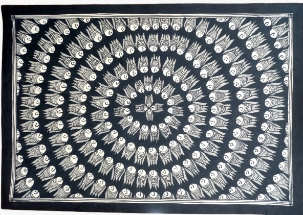 This captivating artwork showcases hundreds of intricately drawn fish arranged in a mesmerizing circular spiral pattern, radiating from the center. Executed in the authentic Madhubani style, the painting uses bold black outlines with natural off-white tones, creating a dramatic and rhythmic visual effect.InMadhubaniart, fish symbolize fertility, abundance, prosperity, and good luck, making this piece both decorative and meaningful. Perfect for wall décor, art collectors, cultural spaces, offices, or gifting, this monochrome folk-art painting adds a timeless, ethnic charm to any interior.