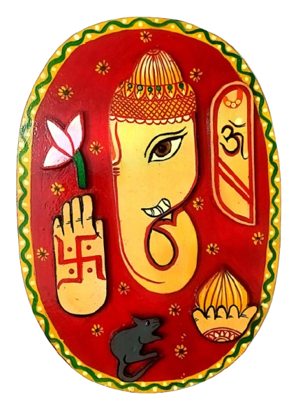 This beautifully crafted wall hanging showcases Lord Ganesha, the symbol of wisdom, prosperity, and new beginnings, painted in the traditional Tikuli art style of Bihar. The artwork is done on a sturdy base and finished with a rich red background, intricate golden detailing, and a decorative green-yellow border that enhances its ethnic appeal. The expressive eyes of Ganesha, the sacred Om symbol, lotus motif, and traditional patterns reflect fine handwork and cultural depth., making it perfect for home décor, pooja rooms, offices, or gifting on festive occasions like Ganesha Chaturthi, Diwali, or housewarmings.