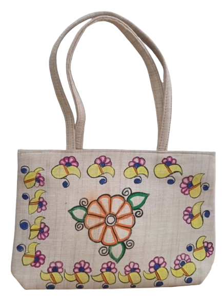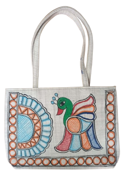 This is a hand-painted jute tote bag featuring vibrant traditional artwork. The design showcases: