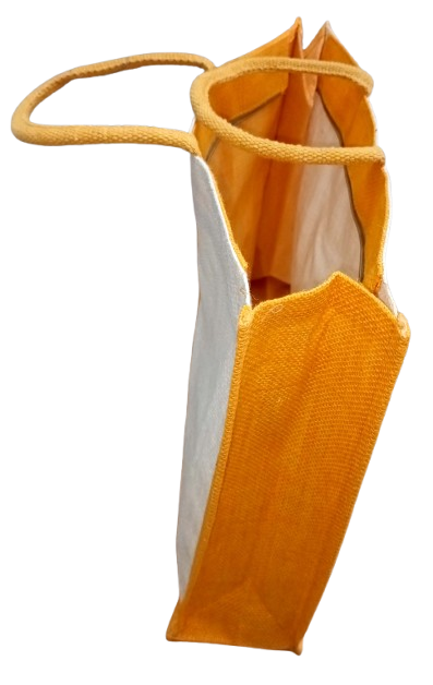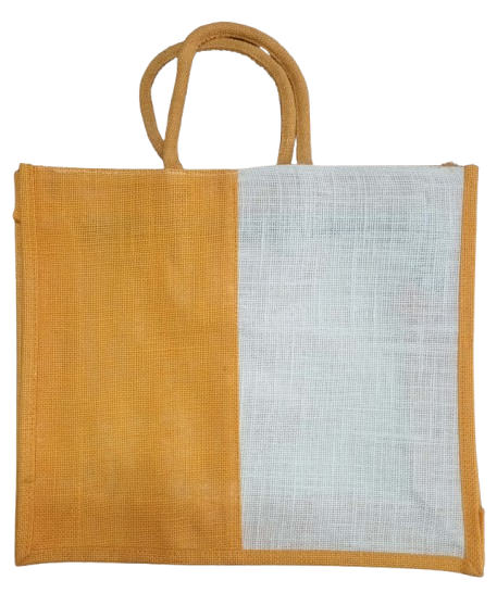 This jute product is a two-tone jute handbag featuring a simple and elegant design. One half of the front panel is mustard yellow, while the other half is plain white jute, creating a clean, modern color-blocked look. The bag has matching mustard jute handles, stitched firmly for durability.