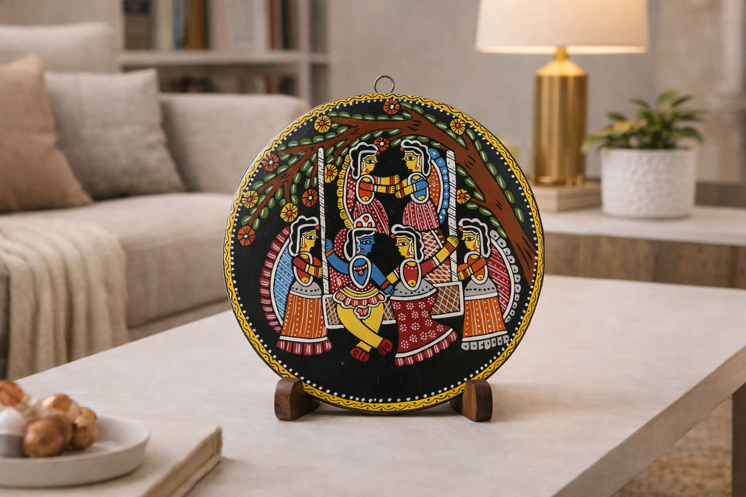This beautifully hand-painted decorative wall plate showcases a vibrant Madhubani folk art portrayal of a joyful Raas Leela scene beneath a flowering tree. The artwork features expressive figures adorned in traditional attire, captured in rhythmic motion around a divine central pair. Rich primary tones, bold black background, fine line detailing, and floral accents highlight the signature aesthetics of Mithila painting.