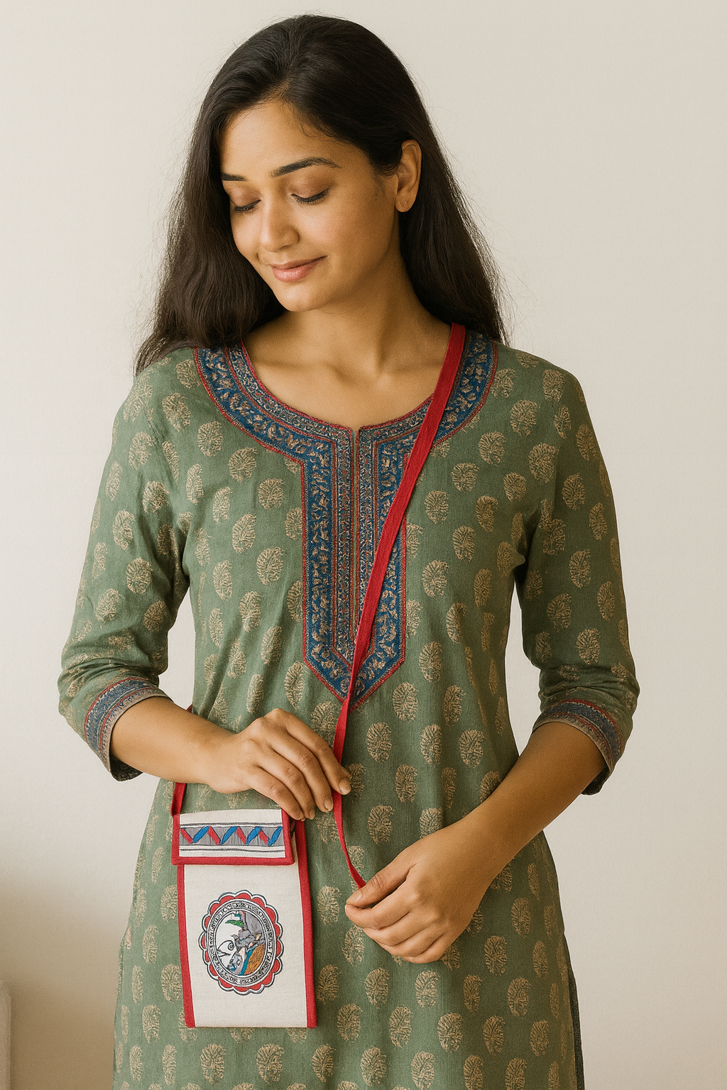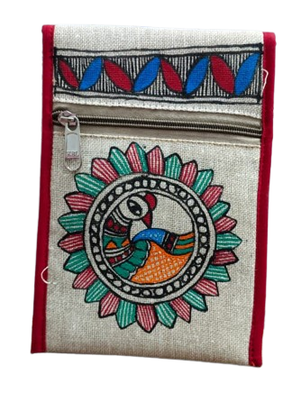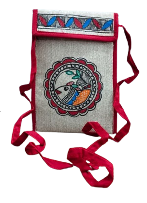 This beautiful sling pouch features an authentic Madhubani painting, meticulously hand-painted by skilled artisans of Mithila, Bihar. The design showcases a traditional fish motif, symbolizing prosperity, good luck, and fertility in Madhubani art. The pouch is finished with a vibrant red fabric border and long adjustable fabric straps, making it lightweight, comfortable, and perfect for daily use. The flap is decorated with an additional Madhubani border pattern.