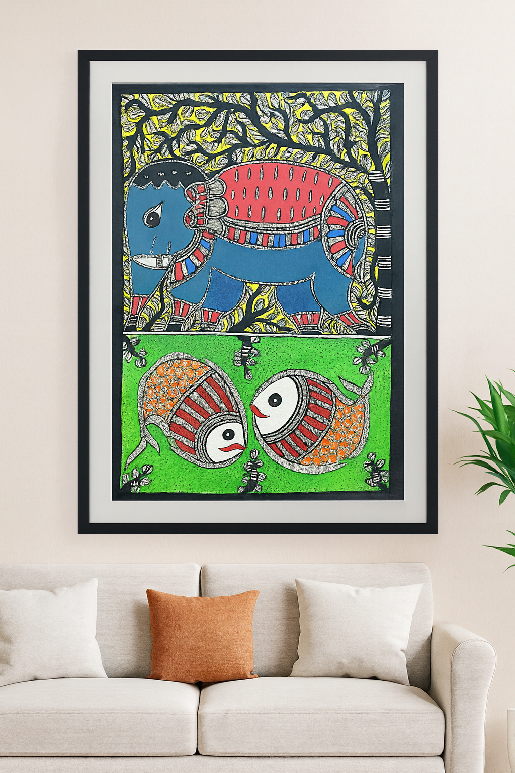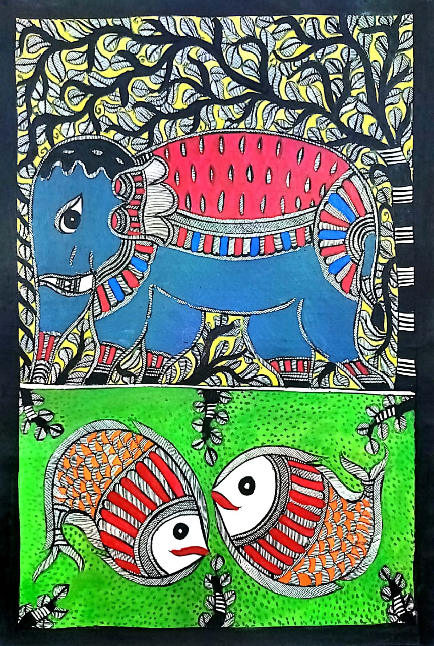 Handcrafted Madhubani Painting – Elephant & Fish Motif (Without Frame)