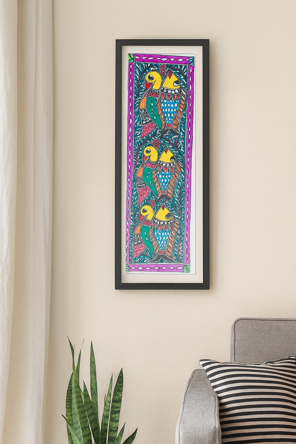 Madhubani Painting – Vibrant Pair of Birds This stunning handmade Madhubani painting features a beautiful arrangement of colorful birds, crafted in the traditional Mithila folk-art style of Bihar. The artwork showcases:
