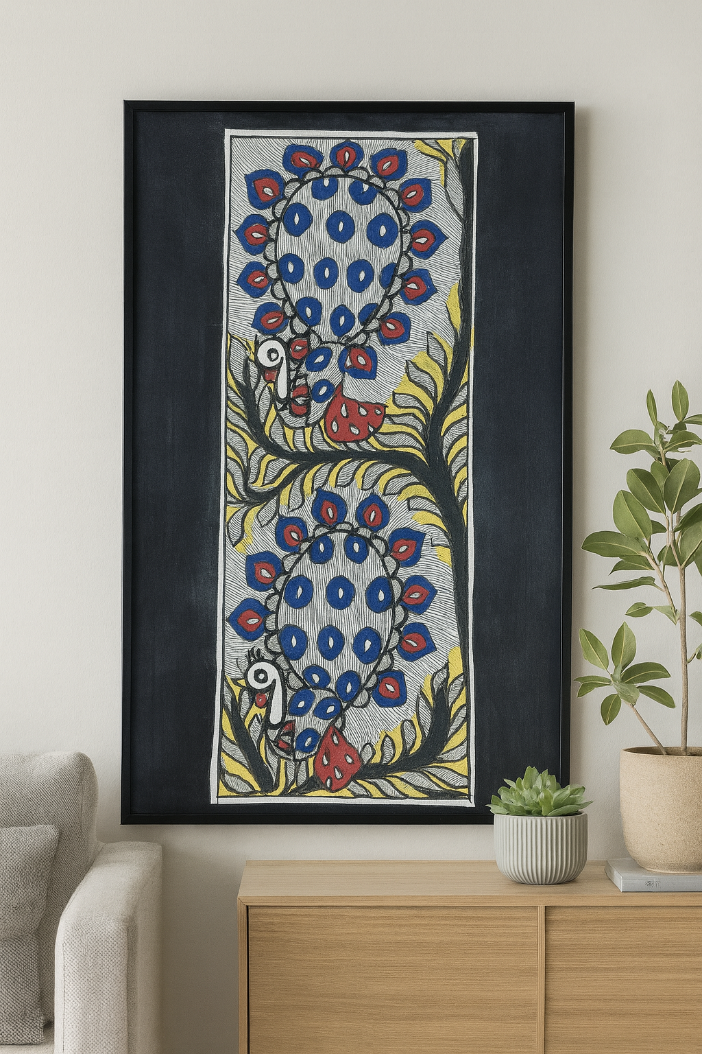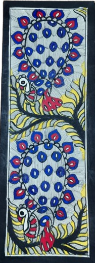 This elegant artwork is an authentic Madhubani (Mithila) painting, featuring two beautifully stylized peacocks arranged in a vertical layout. Peacocks in Madhubani art represent beauty, prosperity, and divine grace, making this piece a meaningful and visually appealing addition to any space.Each peacock is adorned with intricate linework and traditional folk patterns, with their grand tail feathers filled with vibrant blue, red, and white eye motifs. Vibrant color palette featuring blue, red, yellow, black, and white Vertical design, ideal for narrow wall spaces or decorative panels Perfect for home décor, gifting, office walls, and folk-art collections Fully handcrafted by skilled Mithila artisans This Madhubani painting beautifully blends cultural symbolism with artistic craftsmanship, making it a stunning and meaningful addition to any décor.
