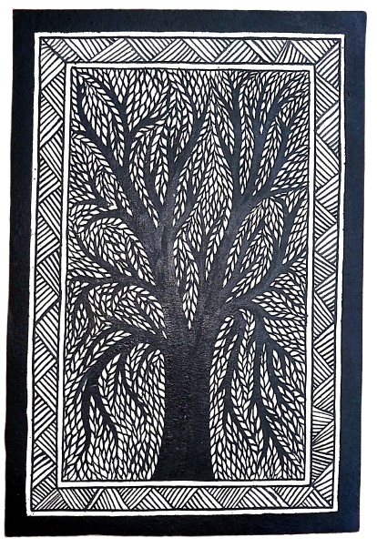 This artwork is a **black-and-white folk-style painting** featuring a beautifully stylized tree. The entire composition is created using **fine, intricate linework**, giving it a detailed and textured appearance. A tall tree dominates the artwork, with a strong trunk that branches out symmetrically. The branches are filled with **dense, teardrop-shaped leaves**, each drawn with precision. The patterning creates a rhythmic, flowing effect, making the tree look lively and dynamic. The inner border is clean and simple. The outer border features an **intricate zigzag and crisscross pattern**, adding depth and enhancing the folk aesthetic.