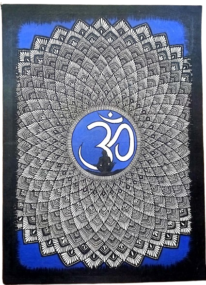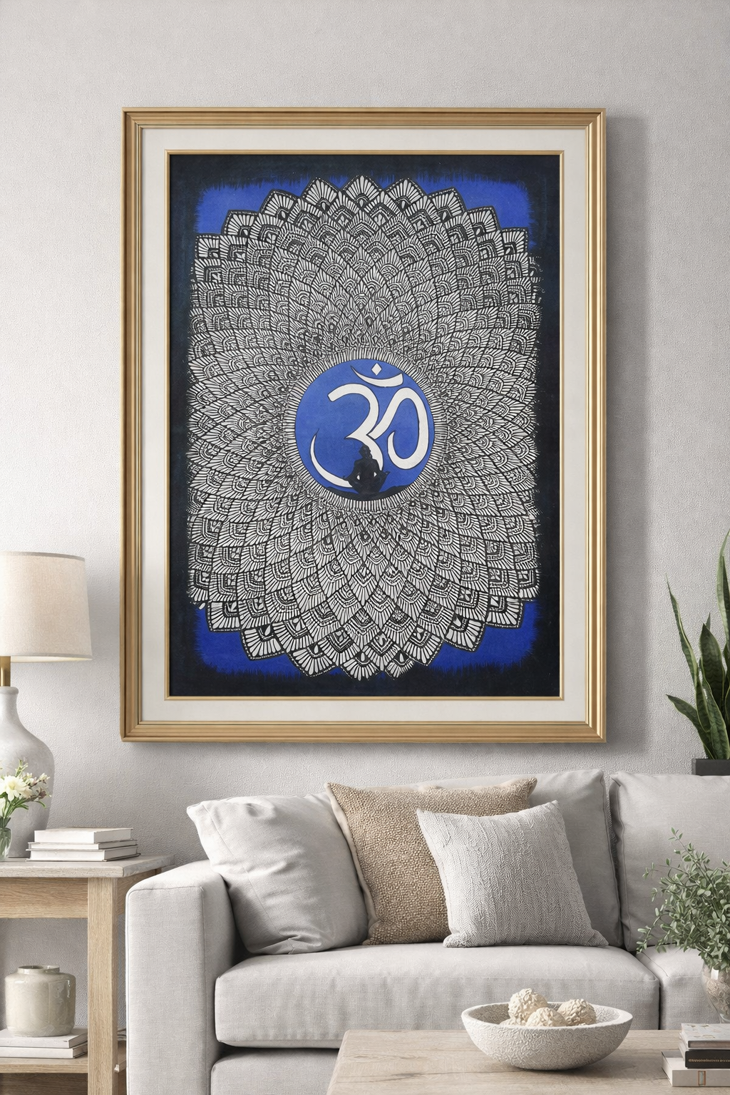 This is a striking mandala-style spiritual painting centered around the sacred symbol “ॐ (Om)”.* The artwork features an intricate **black-and-white mandala** spreading outward in many concentric layers, each filled with detailed hand-drawn patterns, petals, and geometric motifs. At the center, inside a **blue circular aura, the Om symbol is beautifully rendered in white.