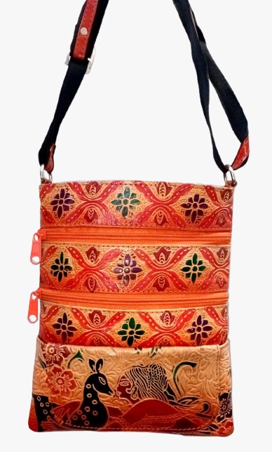 Add a touch of traditional elegance to your everyday style with this handcrafted printed crossbody sling bag. Made from durable fabric with vibrant ethnic motifs, the bag showcases intricate floral and peacock-inspired patterns that give it a unique, artisanal appeal. Designed for practicality, it features multiple zippered compartments on the front, allowing easy organization of essentials like your phone, wallet, keys, and cosmetics. The adjustable black shoulder strap ensures comfortable wear for daily use, travel, shopping, or casual outings.