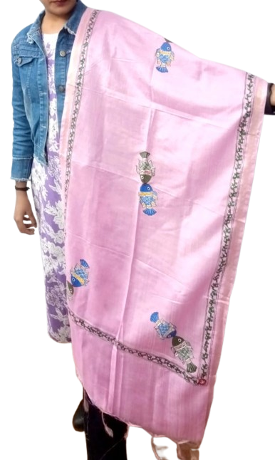 Hand-printed Pink Tikuli Cotton Silk Dupatta (Traditional Indian Folk Art — Tikuli Fish Motifs)