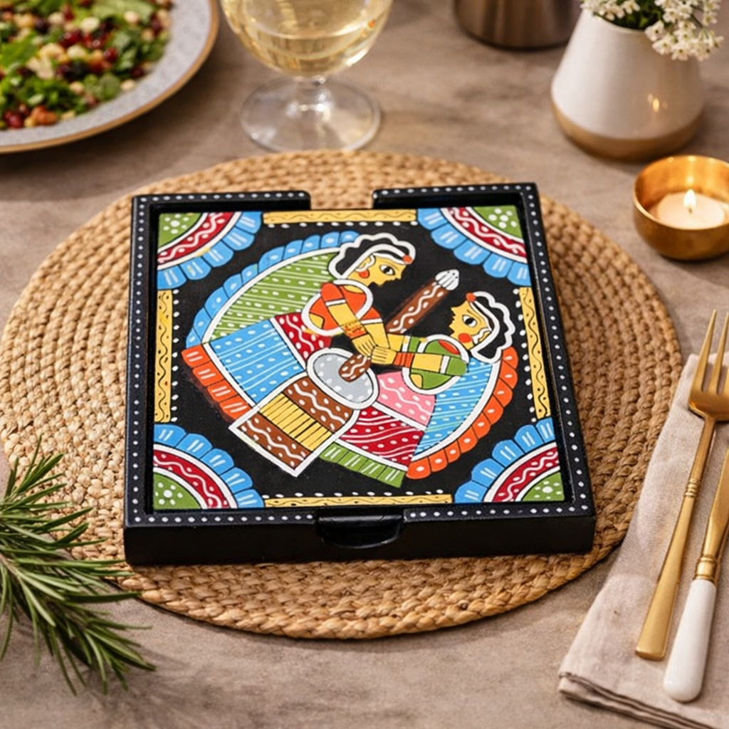 Set against a deep black background, the colourful motifs stand out with striking visual appeal. The coaster is framed with a dotted border, adding a neat and elegant finish. Crafted on a sturdy wooden base, it is both functional and decorative—perfect for adding a cultural touch to tabletops, office desks, or home décor.