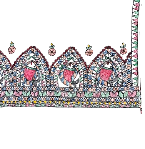 The borders display a repeating pattern inspired by Madhubani-style motifs. The design consists of leaf-shaped panels filled with floral elements and stylized birds, rendered in fine black outlines and filled with muted reds, greens, and yellows. Small floral sprigs appear between the panels, adding rhythm and delicacy to the composition. The edges of the shawl are finished with subtle fringes, enhancing its handcrafted appearance.